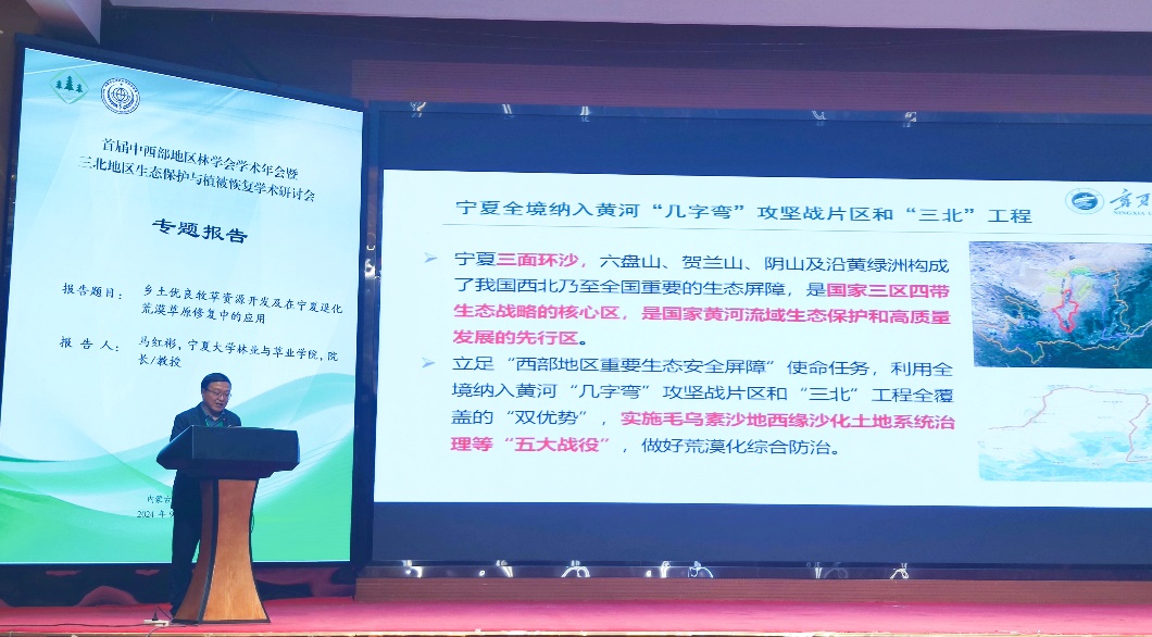 院长马红彬、副院长田佳、教授张萍及青年教师郑翔、何莹莹、海旭莹等人受邀参加了研讨会。会上,院长马红彬教授作了题为“乡土优良牧草资源开发及在宁夏退化荒漠草原修复中的应用”的报告。