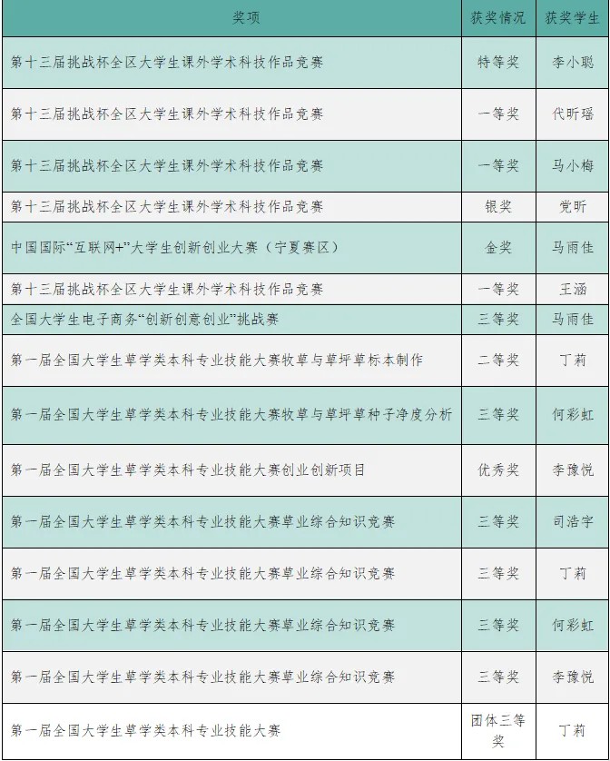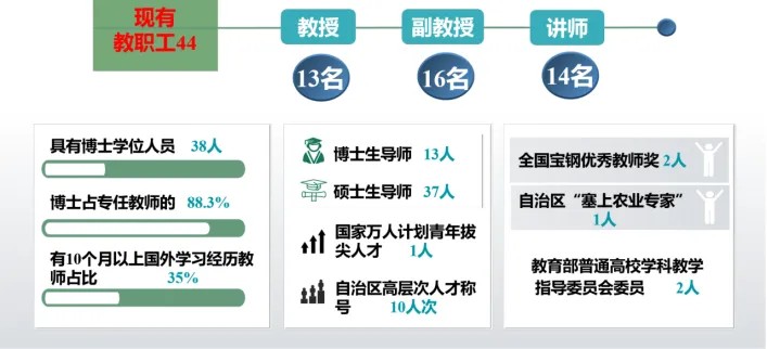 “西部之光”青年学者5人;自治区高层次人才称号10人次;自治区青年托举人才5人,全国宝钢优秀教师奖2人,自治区“塞上农业专家”1人;教育部普通高校学科教学指导委员会委员2人。