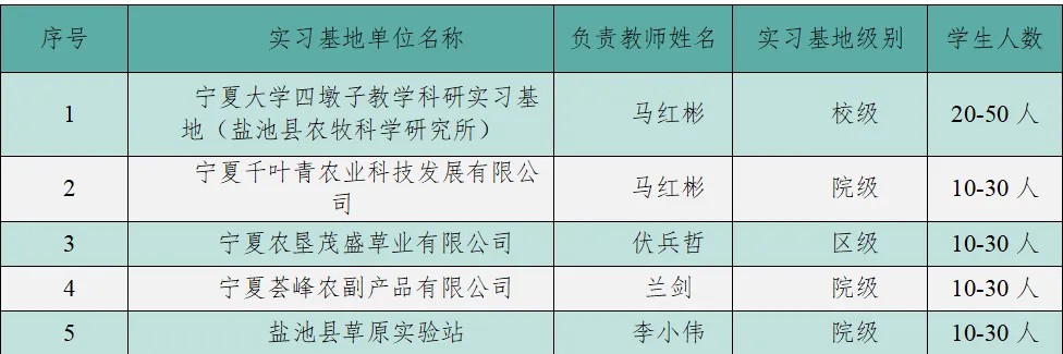 有草业科学、林学、林学专业(枸杞方向)和园林4个本科专业(专业方向)。其中,林学和草业科学(专业)起始于1958年,园林专业起始于1995年。草业科学专业为首批国家一流建设专业、国家特色专业和自治区优势特色专业,林学专业为传统特色骨干专业。草业科学为国家重点学科,草学为宁夏重点学科(优势特色学科)和自治区“双一流”重点建设学科,林学学科为传统骨干特色学科。建有草学一级博士、硕士授权点,在农艺与种业领域设有草业专业硕士;林学学科设有林业专业硕士学位授权点,建有草学博士后流动站。