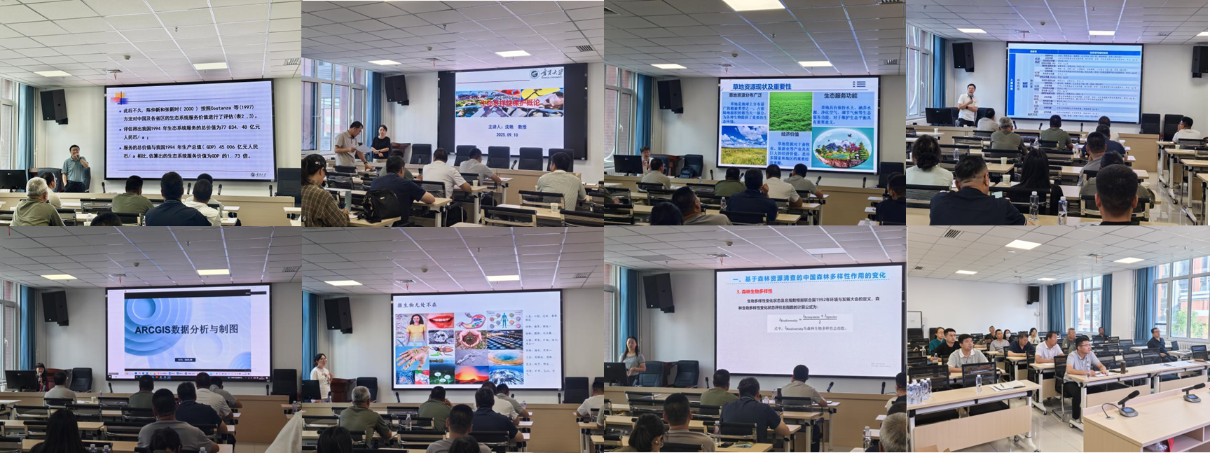 马红彬教授、沈艳教授、李小伟教授、王国会副教授、米楠副教授、李慧萍博士、何莹莹博士分别以《自然保护区生态服务和生态价值评估》、《生物多样性保护概论》《草地植物多样性监测及保护》、《保护区环境监测与调查》、《ArcGIS应用、林草遥感和智慧林草》、《林草生态系统微生物及其多样性》、《森林(林地)多样性监测与保护》为主题,系统阐述了生物多样性的概念、价值以及面临的挑战,使学员们对生物多样性保护有了全面而深入的了解,并结合实际案例,详细讲解了方法和技术,为学员们在实际工作中开展环境监测提供了有力的指导。