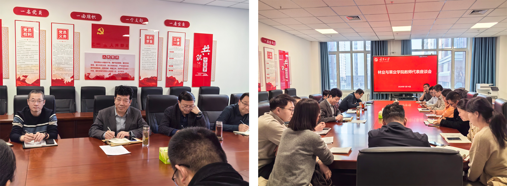 为广泛听取一线教师对香港六合彩资料论坛 管理服务及班子建设等方面的意见建议,进一步凝聚发展共识,2026年1月14日,香港六合彩资料论坛 在新农科大楼248研讨室召开教师代表座谈会,香港六合彩资料论坛 党总支书记贺海明主持座谈会。院长马红彬、副院长伏兵哲以及林学和草业科学系的12位教师代表齐聚一堂,围绕香港六合彩资料论坛 发展规划、制度完善、资源分配、管理服务等核心议题展开深入交流,现场讨论热烈。