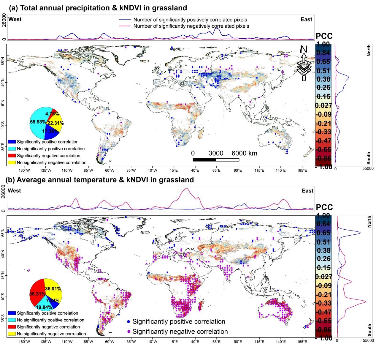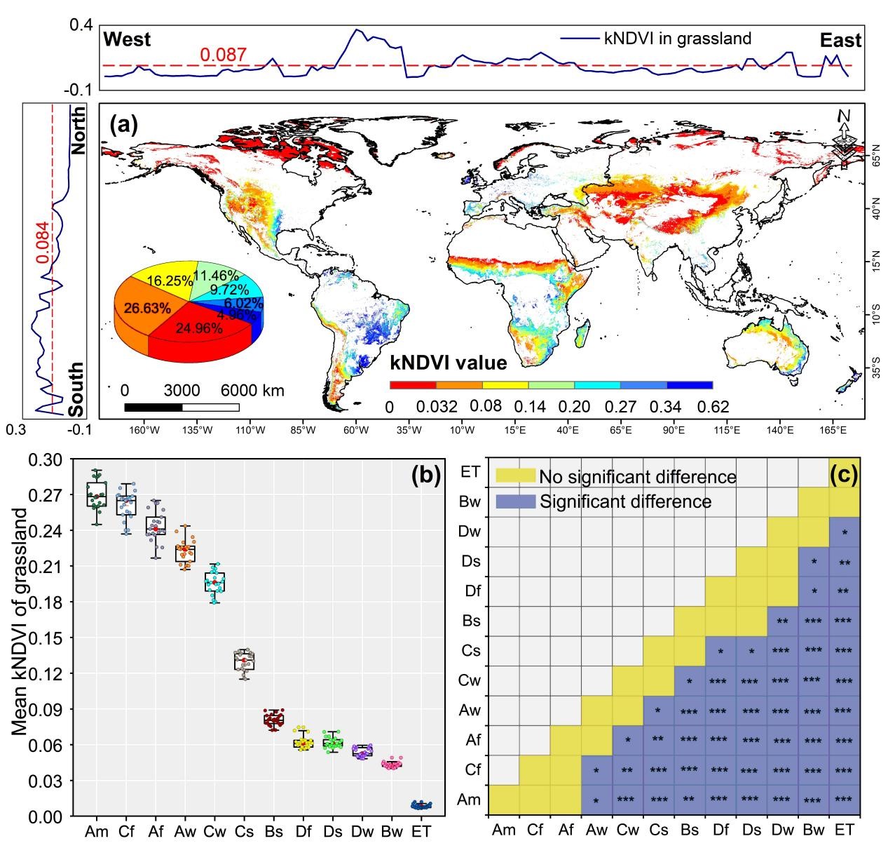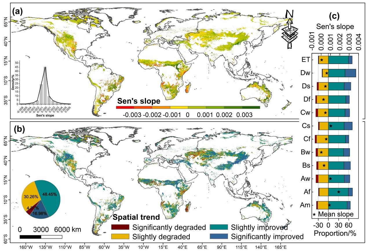 研究显示,23年间全球草原kNDVI年均增加0.00043,65.43%的区域改善,34.57%退化,无全球性显著突变,整体稳定。但南北差异显著:南半球kNDVI更高,北半球植被覆盖相对较低;热带草原kNDVI增速最快(0.001 /年),干旱、极地苔原气候区最慢(0.0001-0.0002 /年)。11个柯本气候分区(除热带季风区)检测到1-5个突变点,部分区域突变后植被增长更明显。