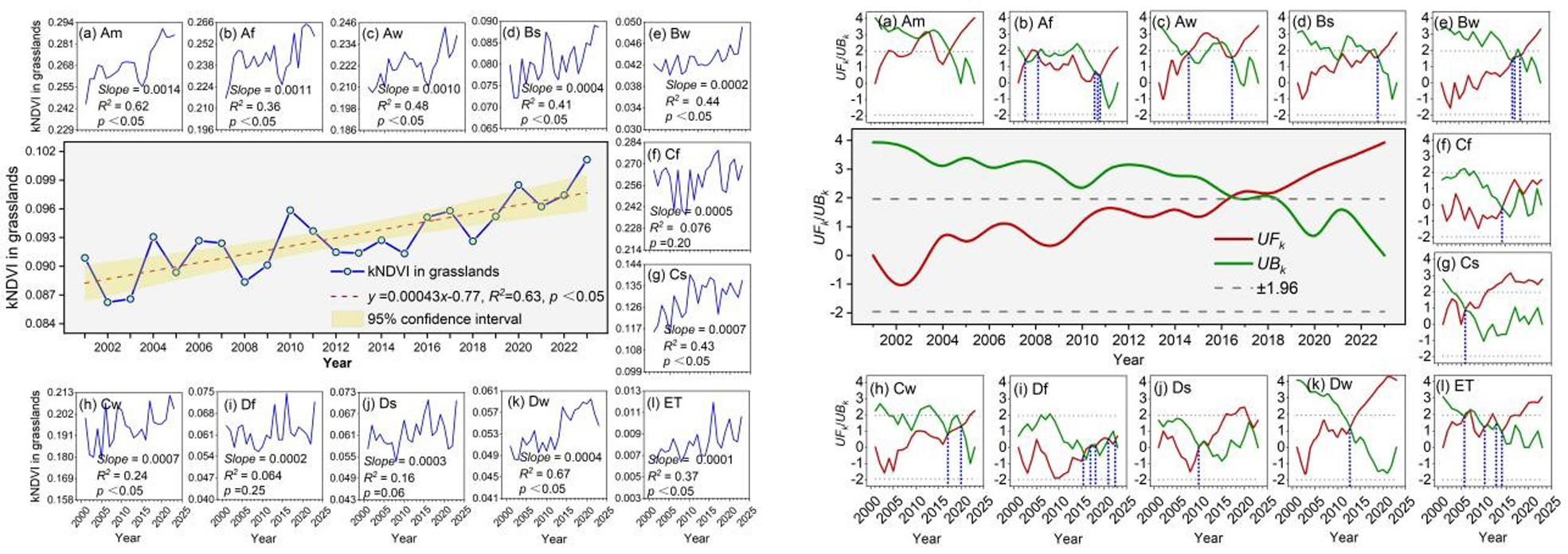 图2 2001—2023年草地kNDVI时间变化趋势;图3 2001—2023年草地kNDVI Mann-Kendall突变检验结果