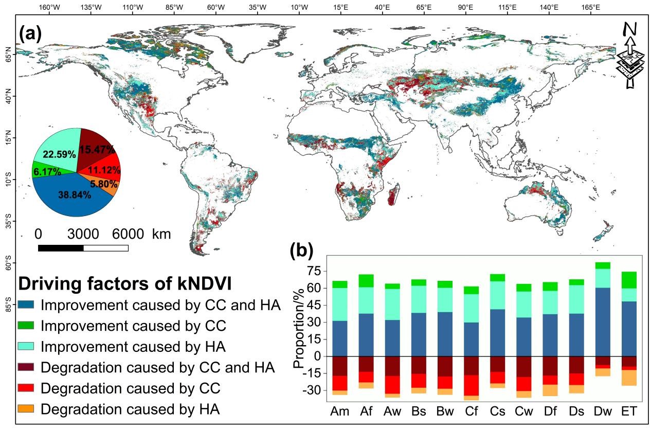 驱动力上,降水与kNDVI正相关(72.91%的区域),与温度负相关(72.32%的区域);人类活动是主导,73.25%的区域受其正向影响(平均贡献度61.15%),中、澳、美等国生态政策成效显著,但哈萨克斯坦等区域因过度放牧致退化。仅5.80%的退化由人类单独导致,低于气候单独导致的11.12%。